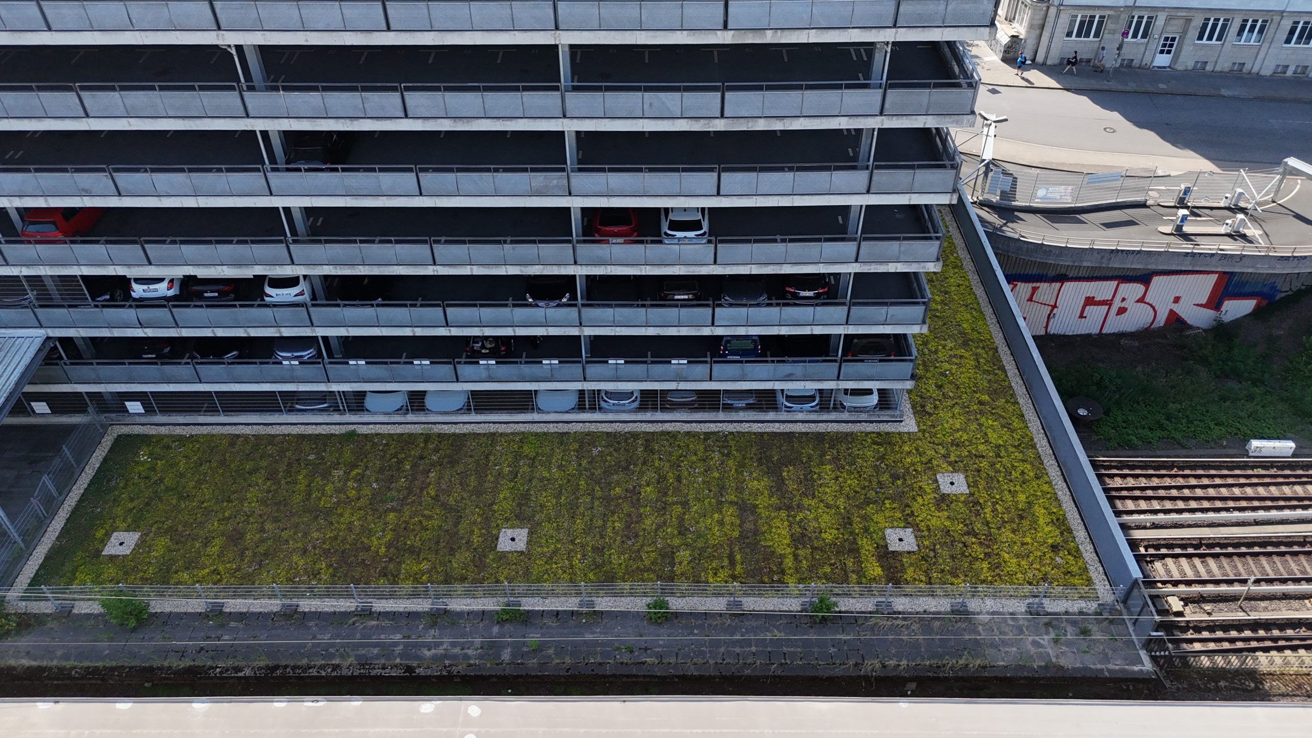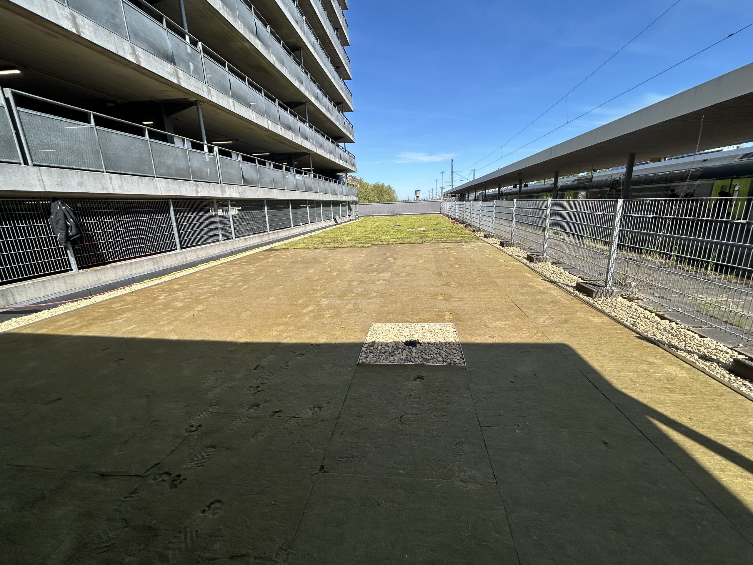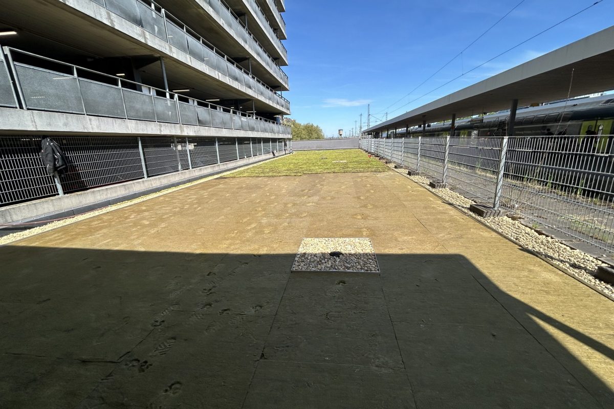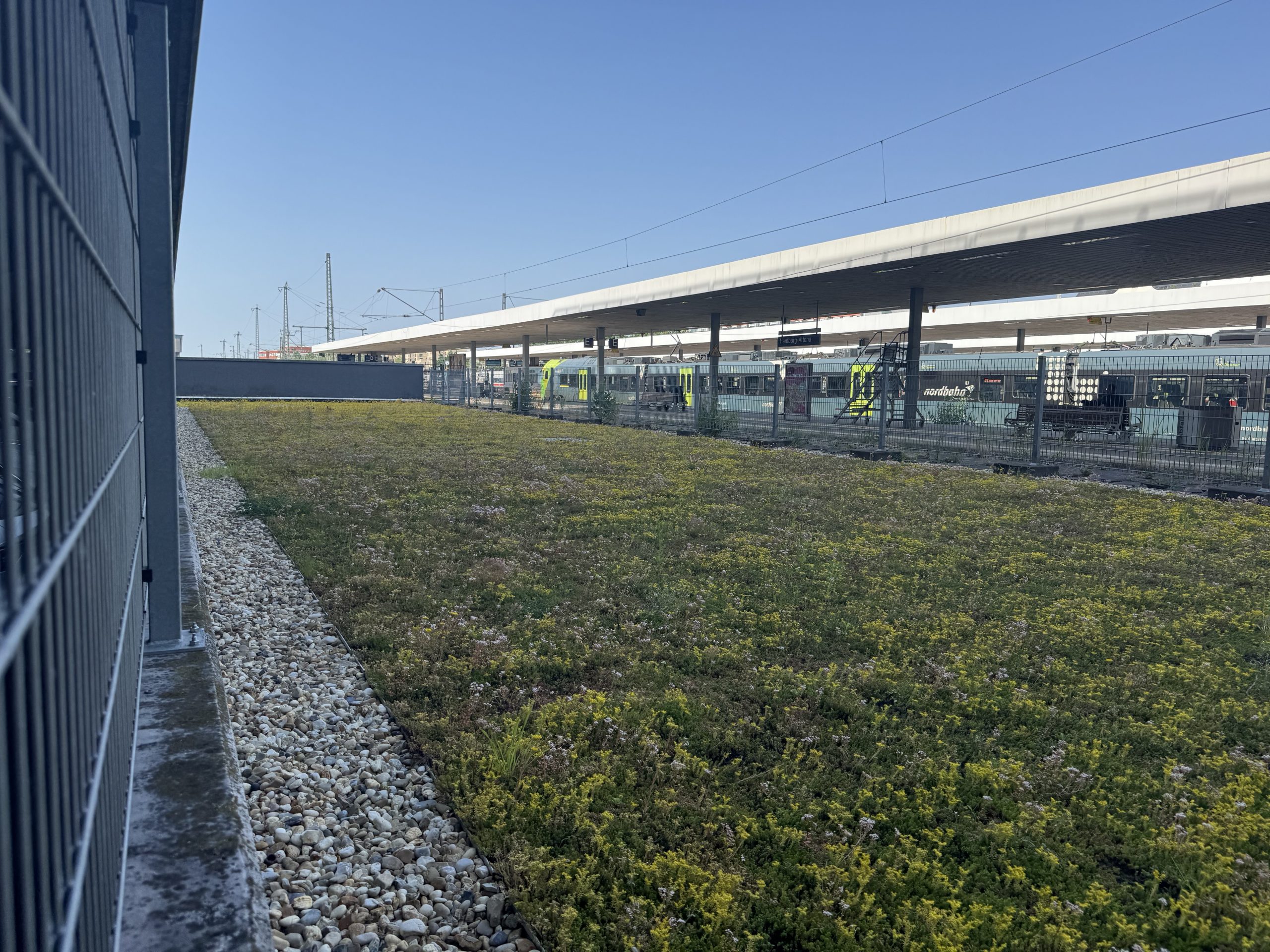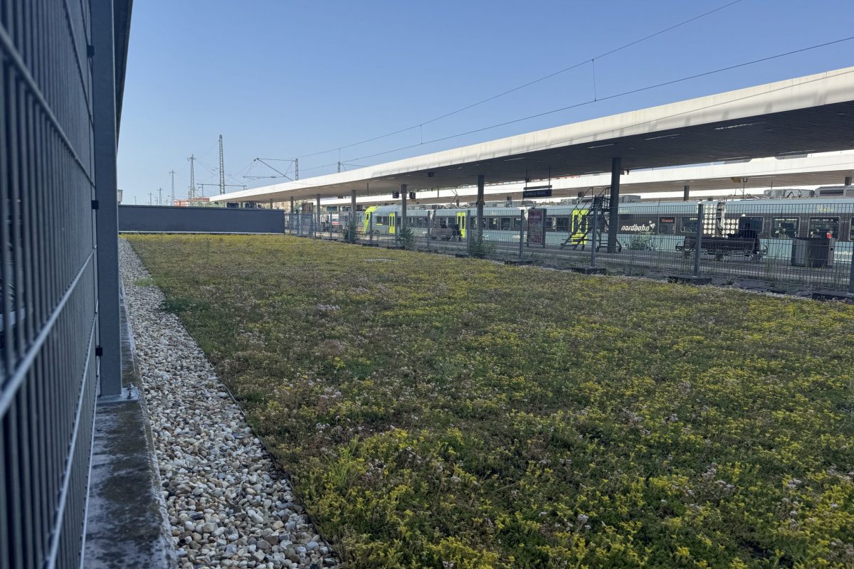 Im Anschluss wurde ein Gründach-Leichtsystem der Firma Hasse & Sohn aufgebracht. Dieses System reduziert die Abflussmenge des Regenwassers erheblich, entlastet die Kanalisation und sorgt gleichzeitig für eine optische Aufwertung der Dachfläche im stark frequentierten Bereich des Bahnhofs Altona.