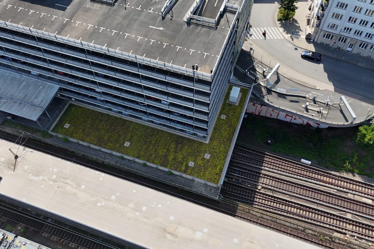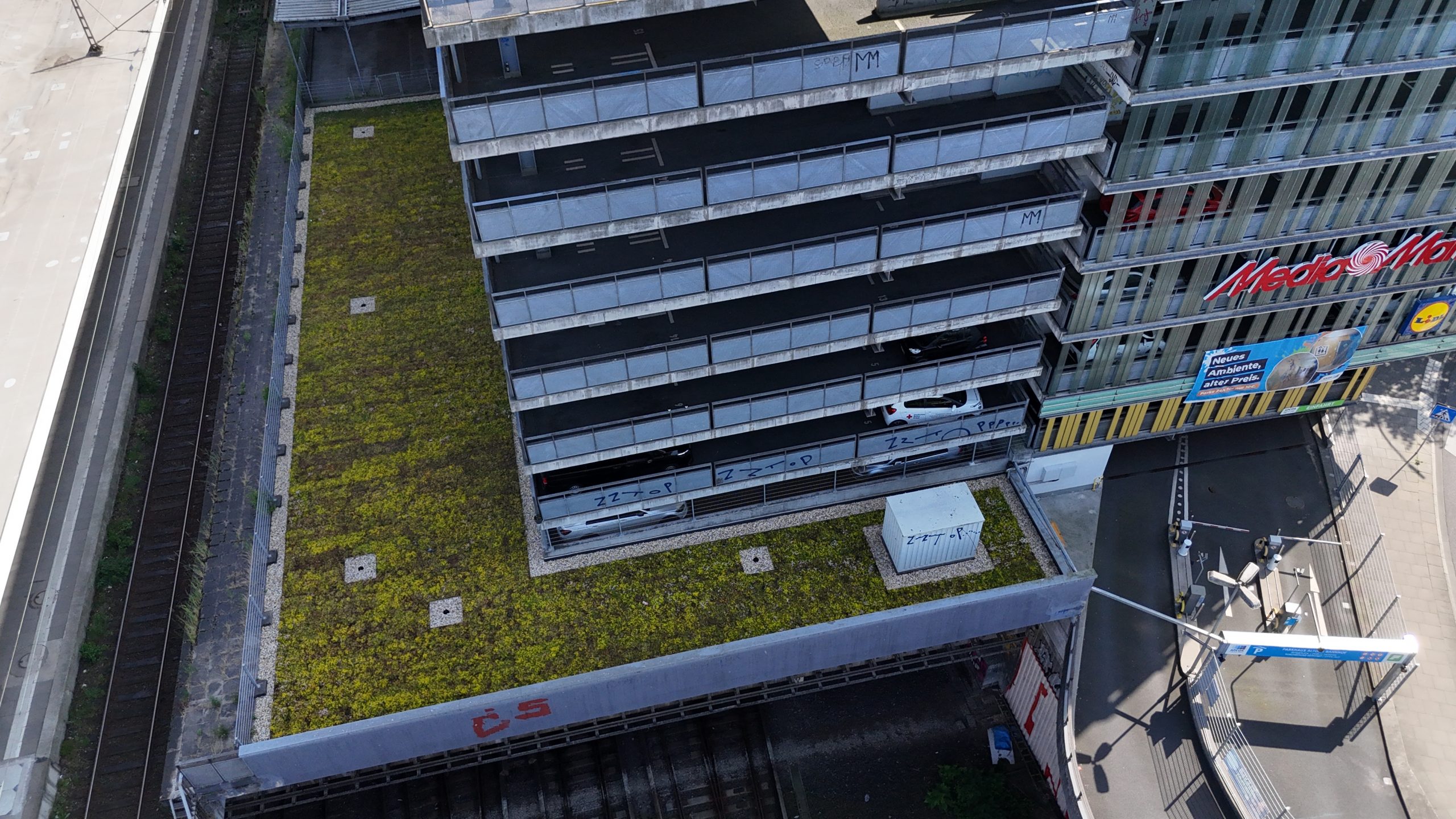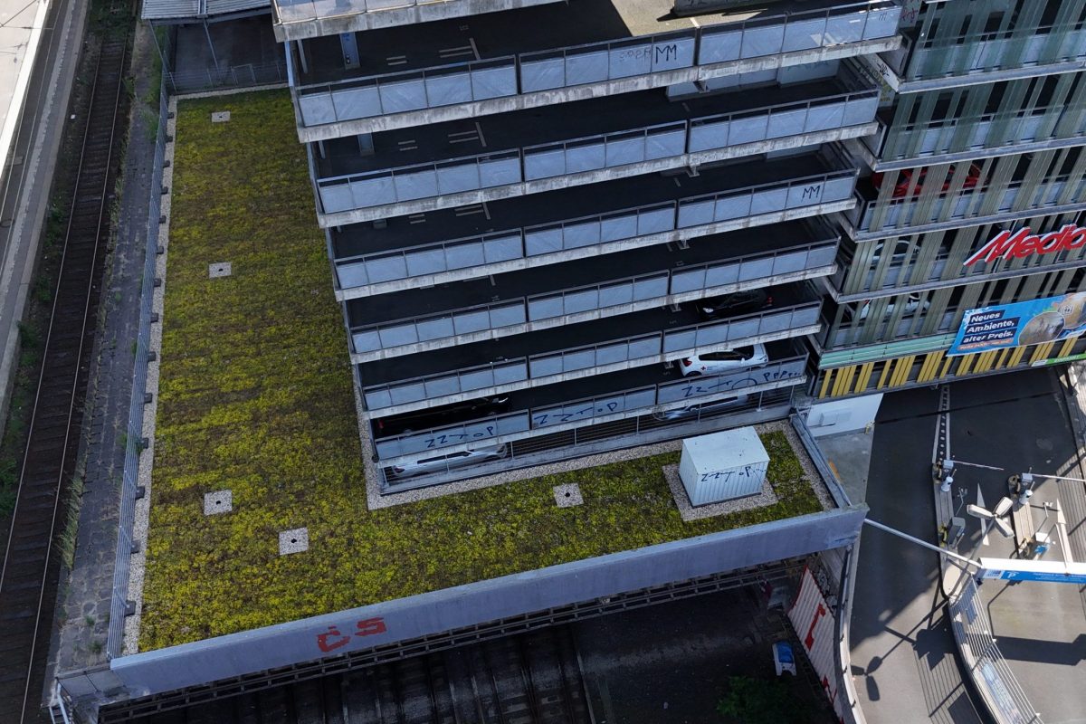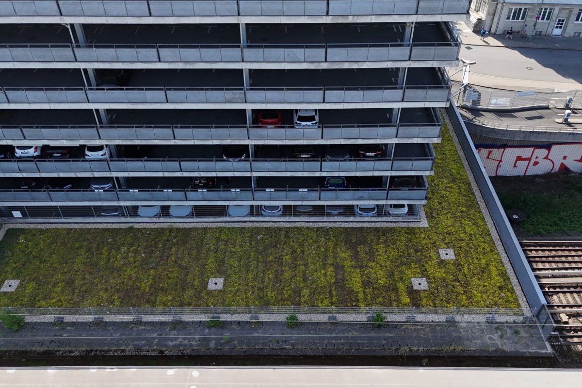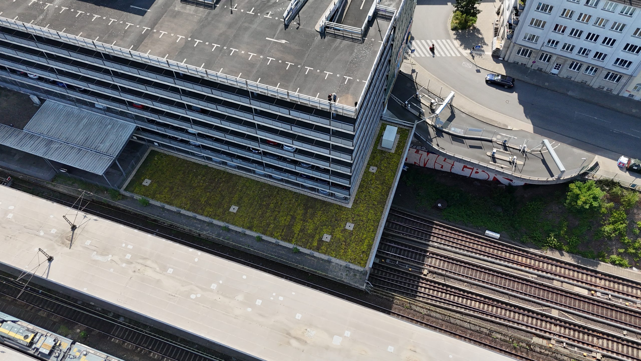 Im Anschluss wurde ein Gründach-Leichtsystem der Firma Hasse & Sohn aufgebracht. Dieses System reduziert die Abflussmenge des Regenwassers erheblich, entlastet die Kanalisation und sorgt gleichzeitig für eine optische Aufwertung der Dachfläche im stark frequentierten Bereich des Bahnhofs Altona.
