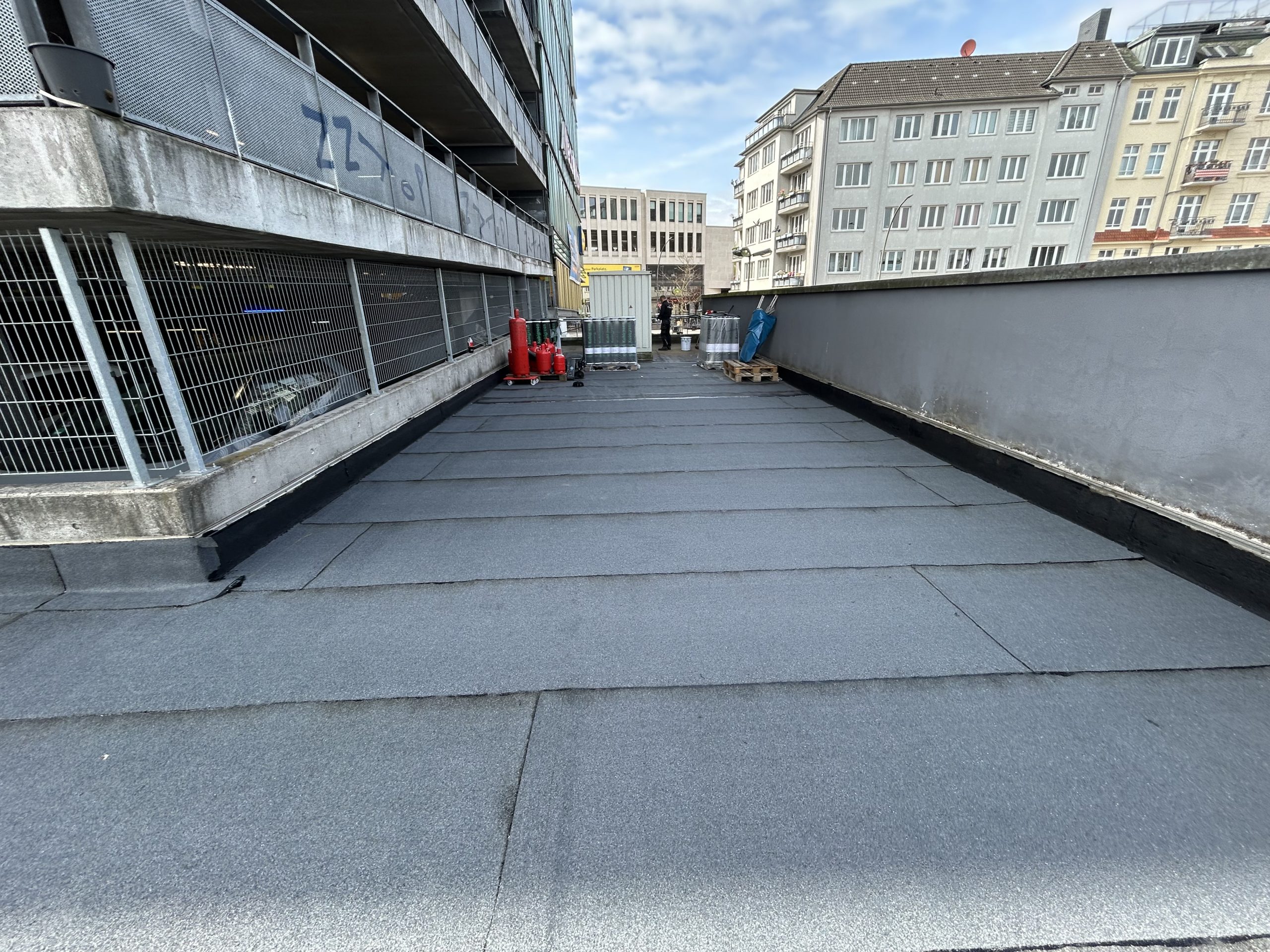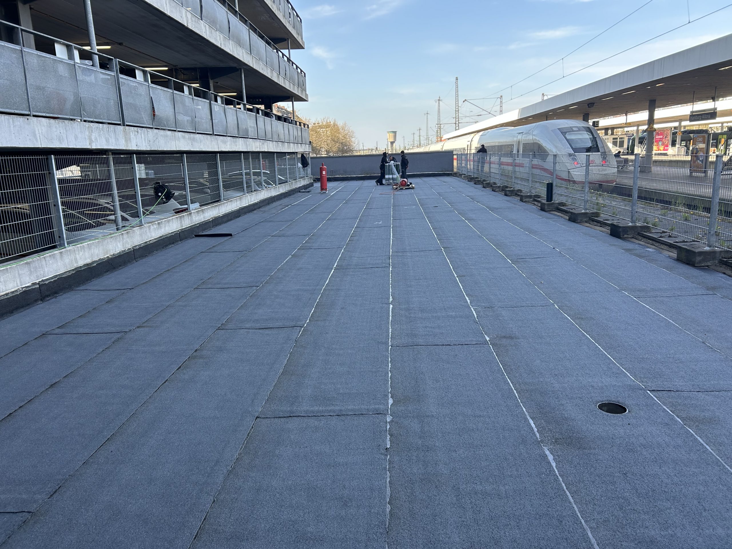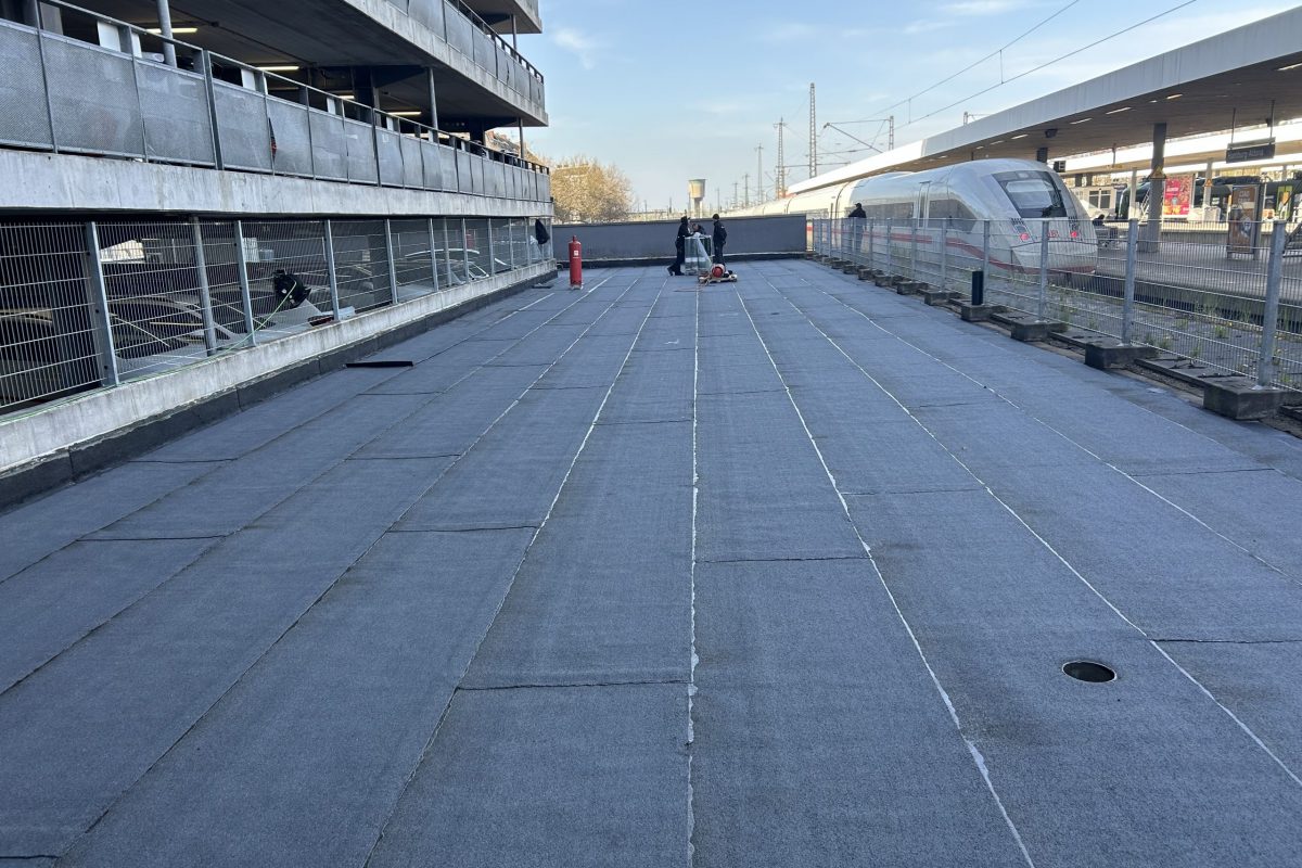 Die Abdichtungsarbeiten wurden zweilagig mit hochwertigen Bitumenbahnen der Firma Hasse & Sohn ausgeführt, um eine dauerhaft sichere Dachfläche zu gewährleisten. Aufgrund der komplexen logistischen Bedingungen im laufenden Bahnhofsbereich erfolgte die Ausführung in einem präzise abgestimmten Arbeitsablauf.
