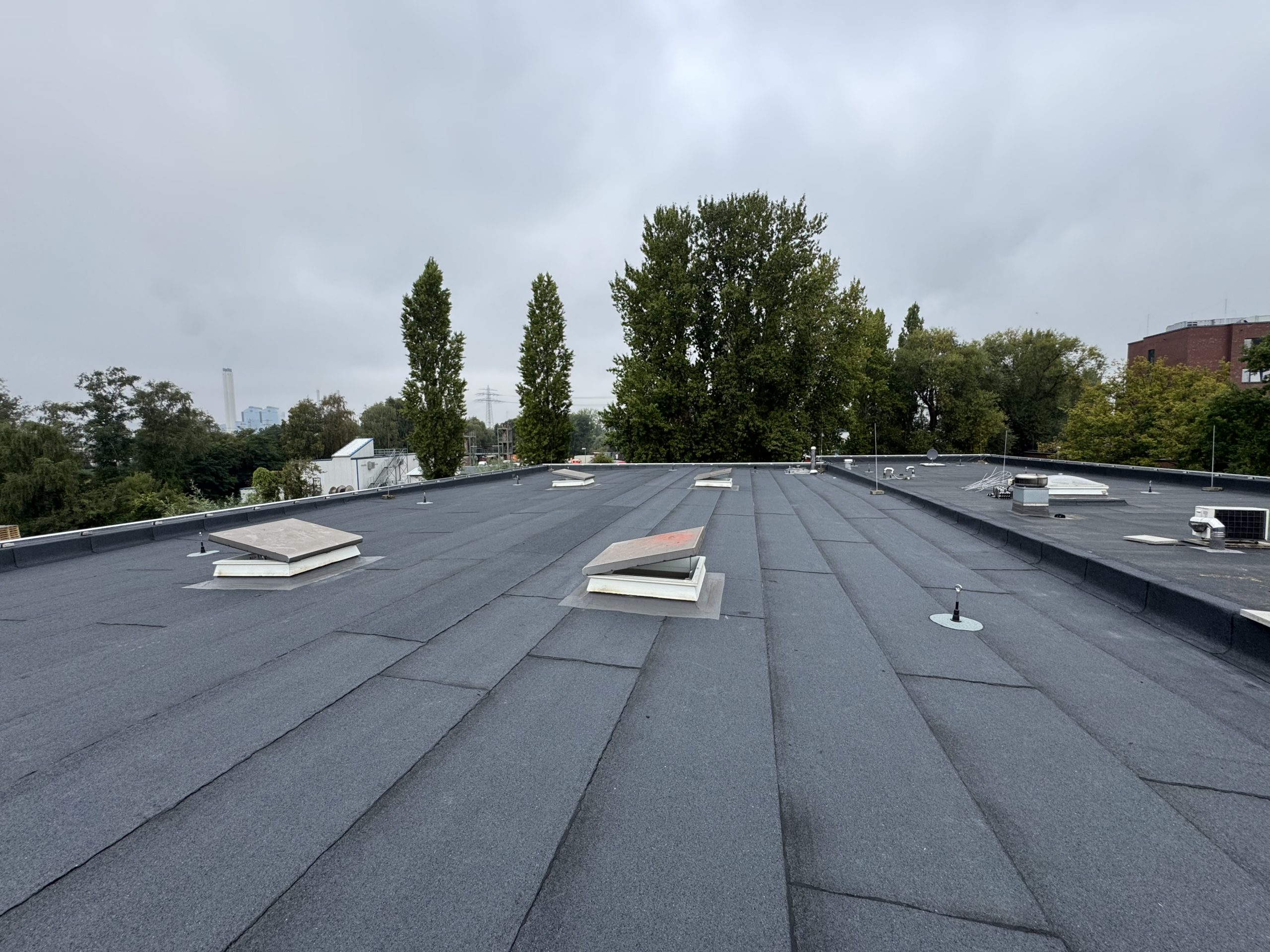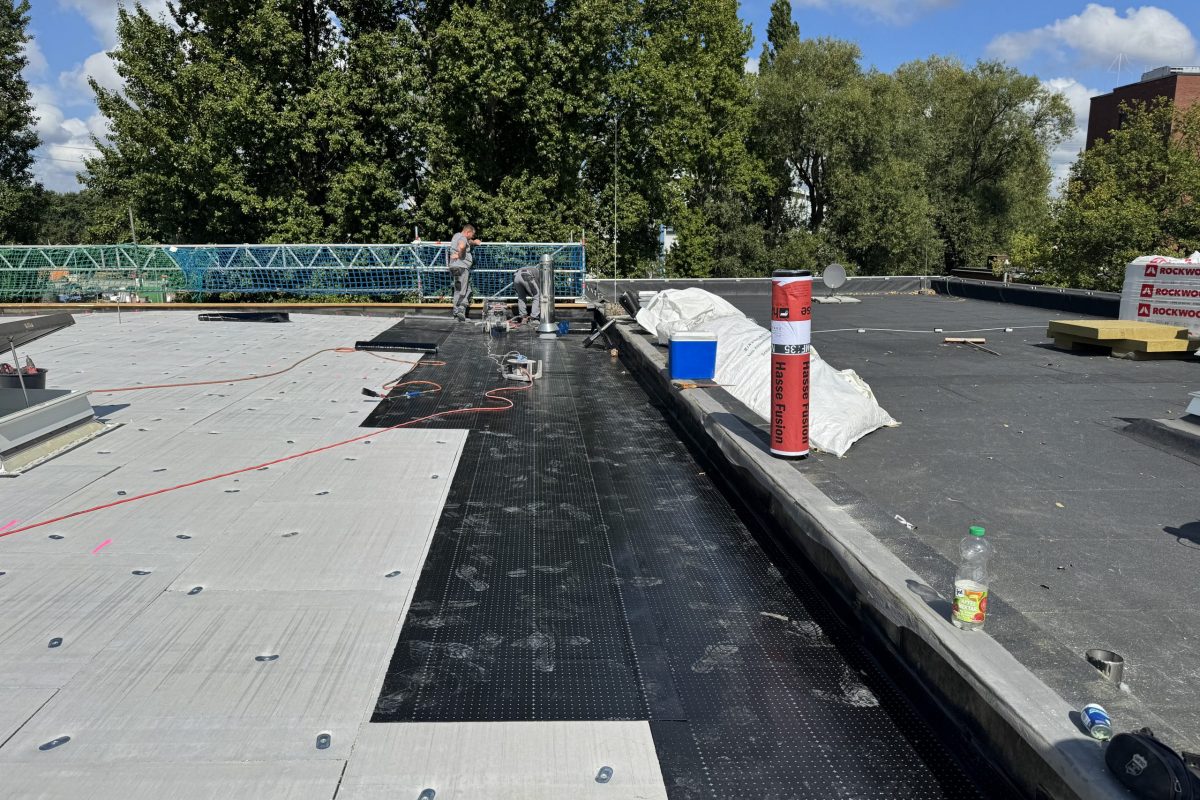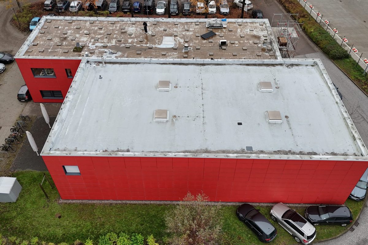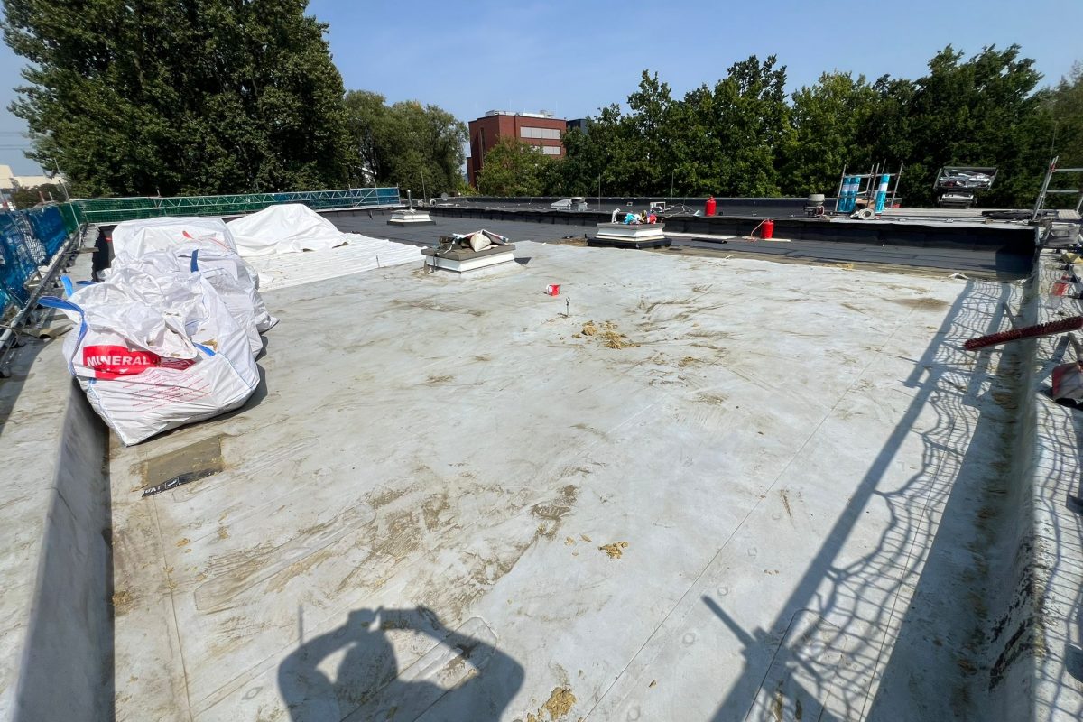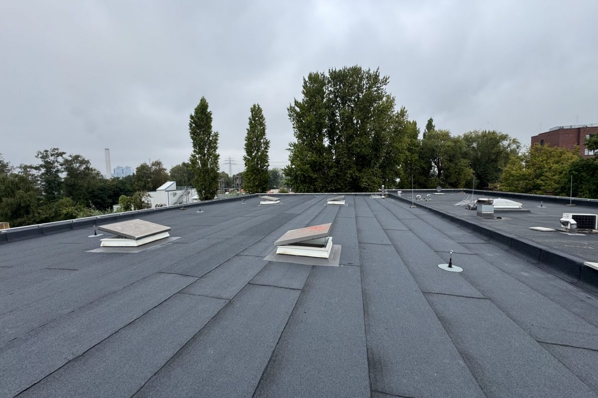 Abschließend wurde die gesamte Dachfläche dreilagig bituminös abgedichtet, sodass die Flächen nun optimal für die geplante Photovoltaik-Belegung vorbereitet sind.