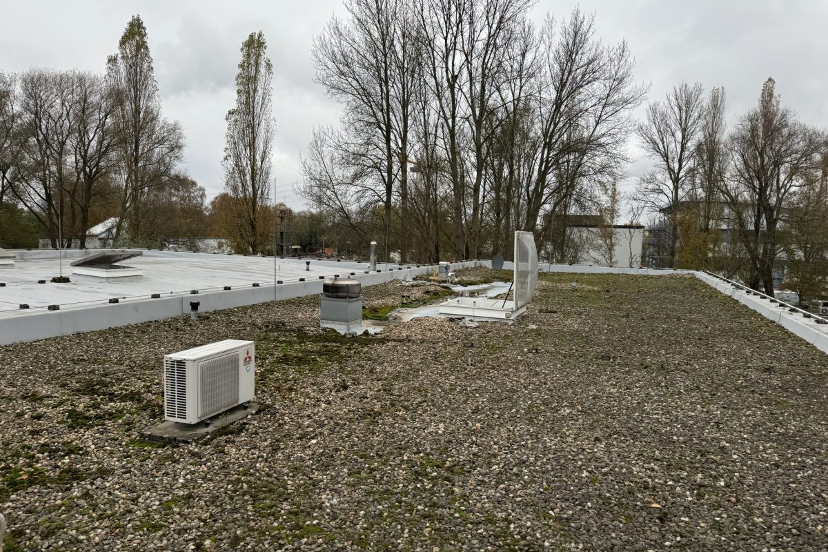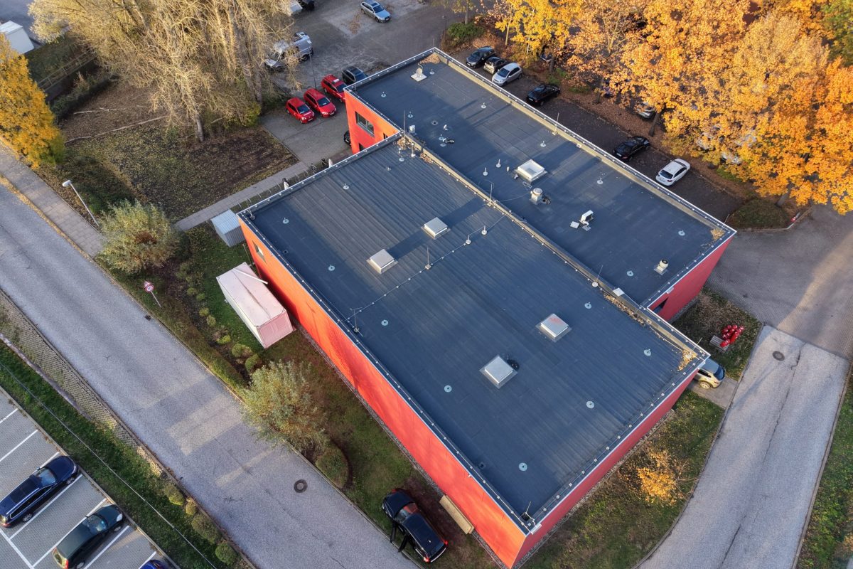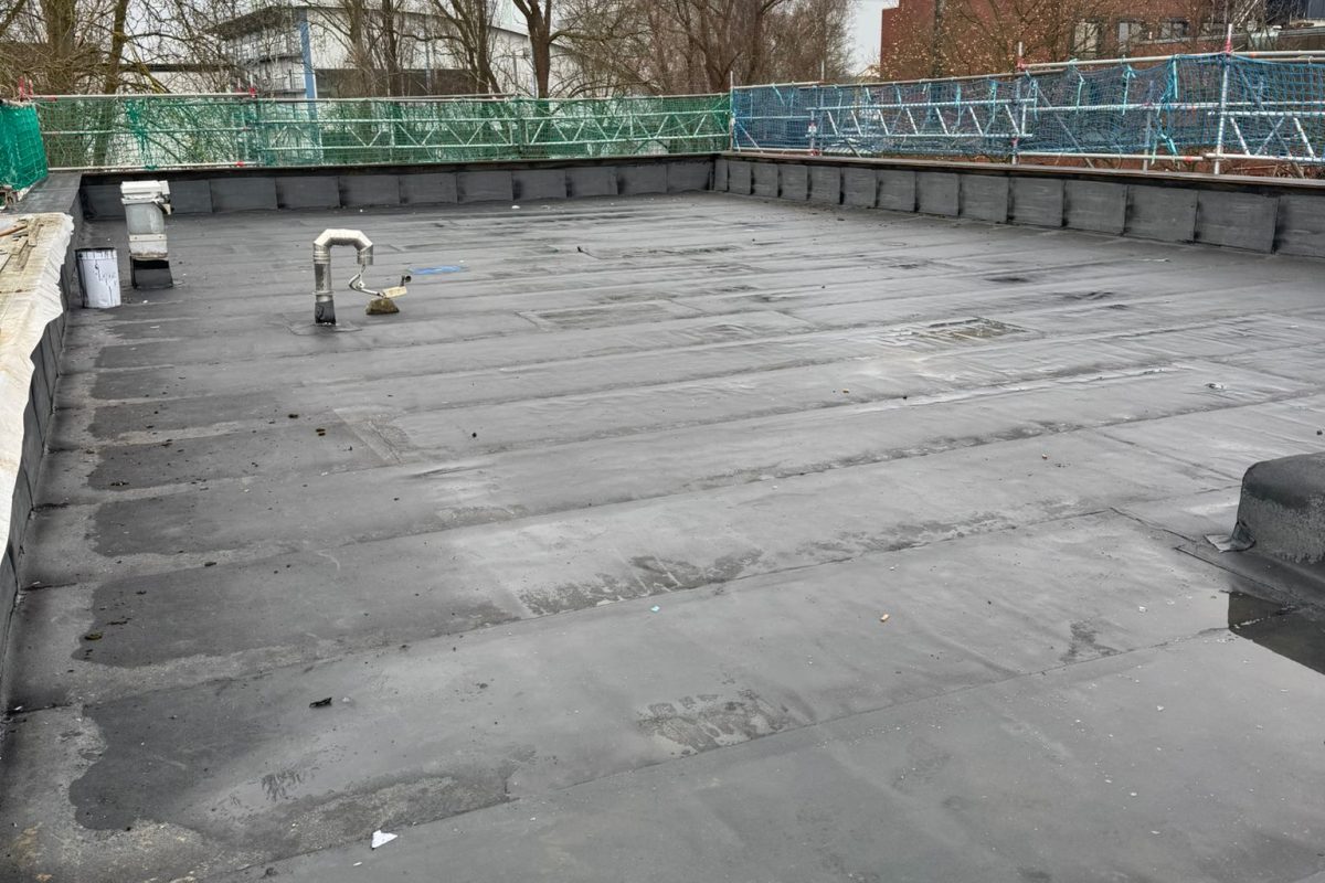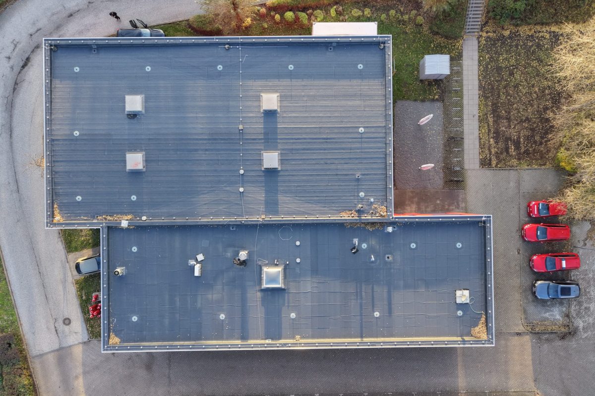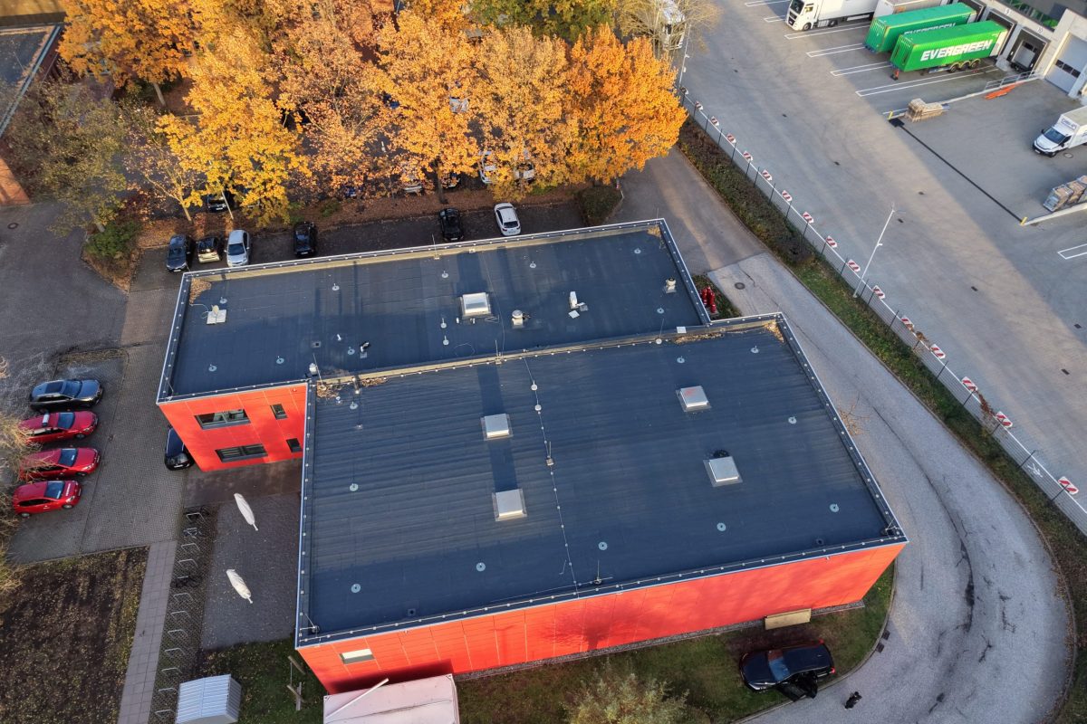 Abschließend wurde die gesamte Dachfläche dreilagig bituminös abgedichtet, sodass die Flächen nun optimal für die geplante Photovoltaik-Belegung vorbereitet sind.