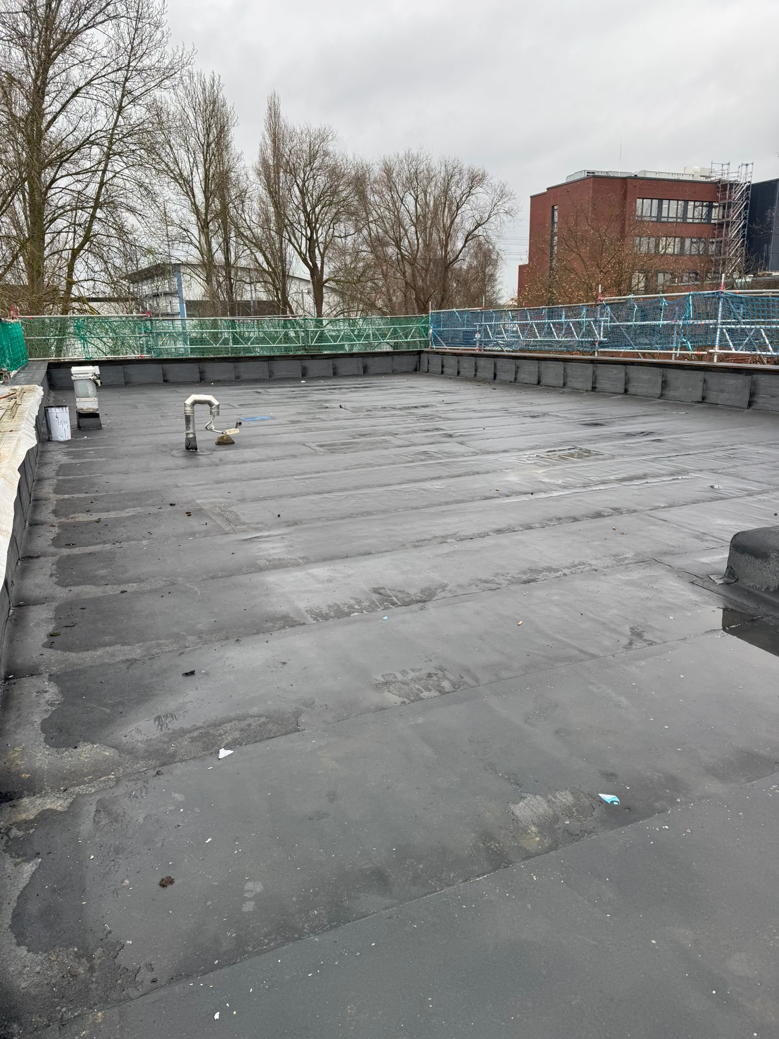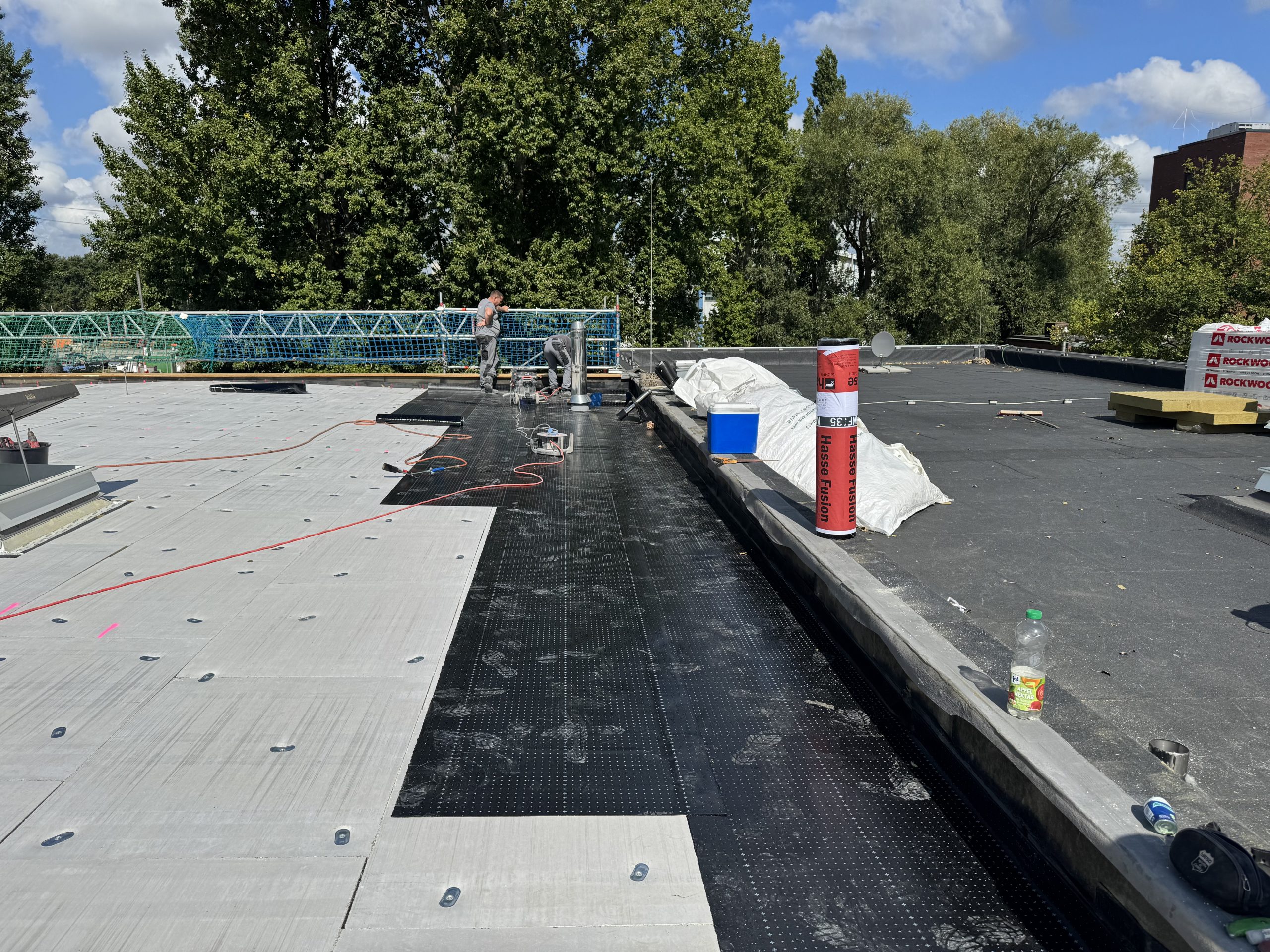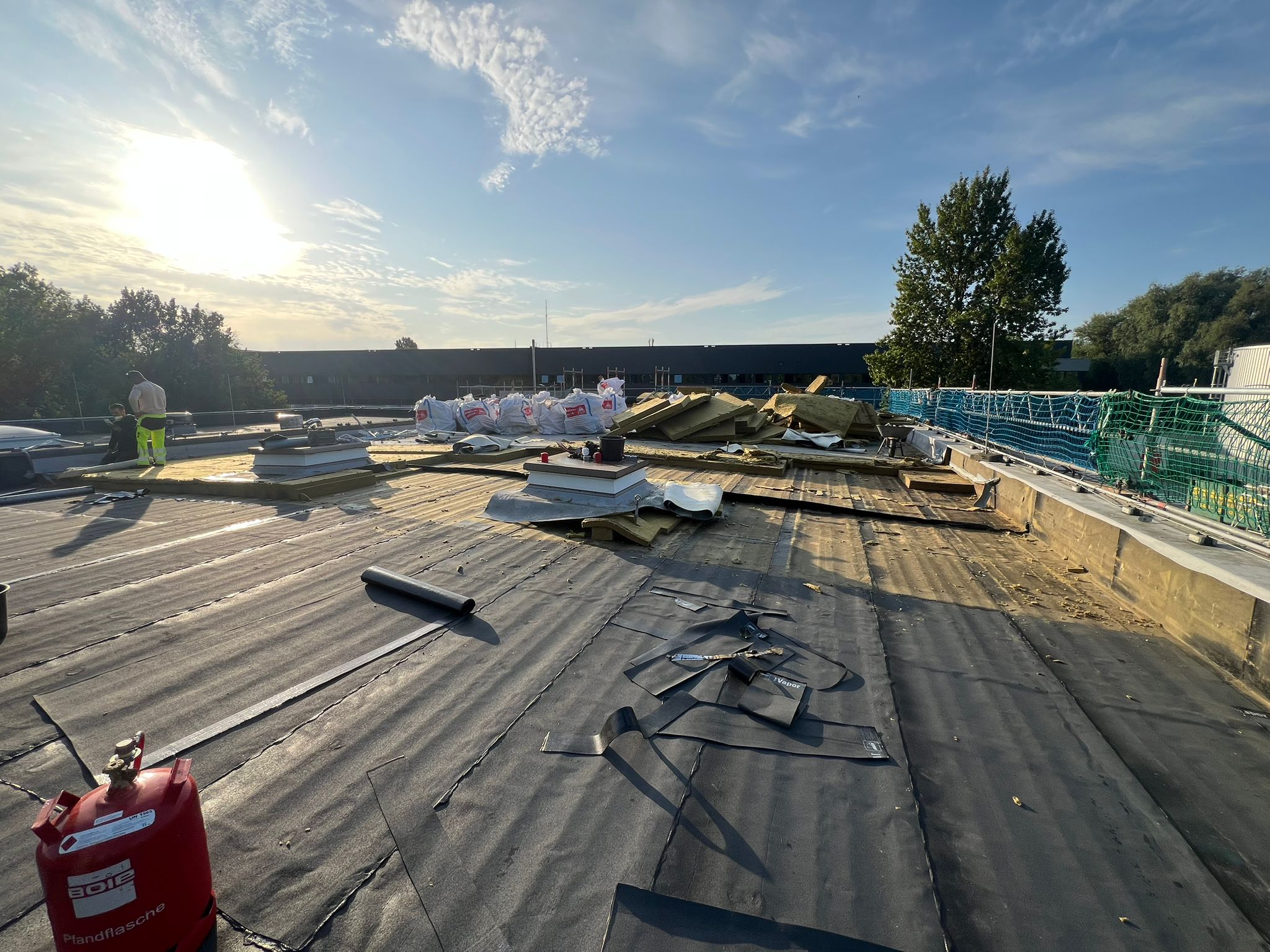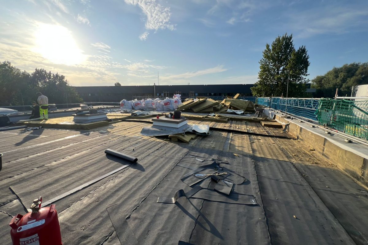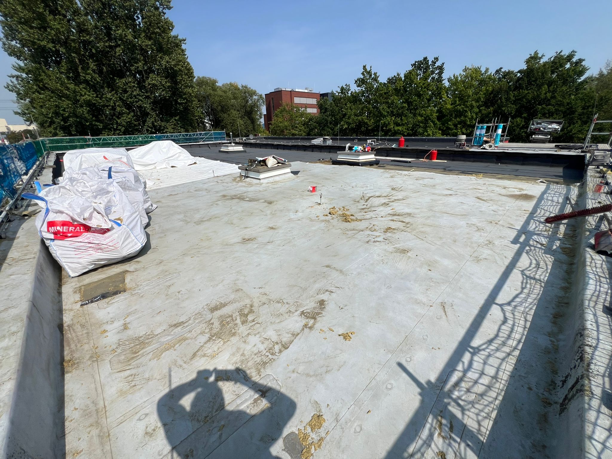 Abschließend wurde die gesamte Dachfläche dreilagig bituminös abgedichtet, sodass die Flächen nun optimal für die geplante Photovoltaik-Belegung vorbereitet sind.