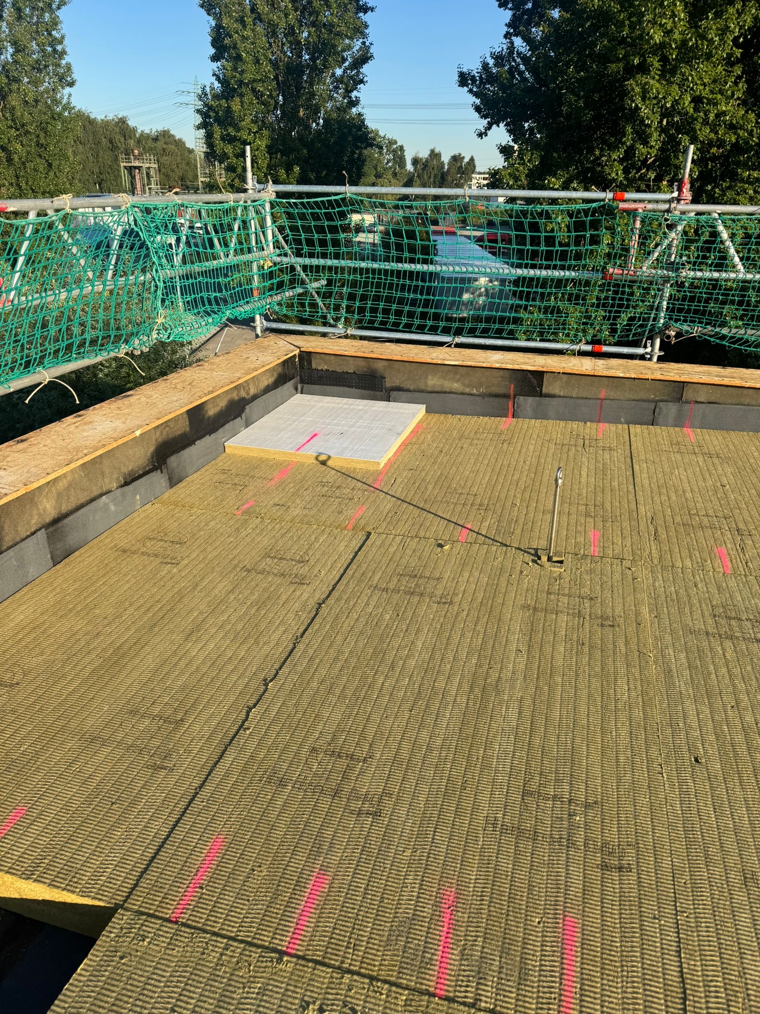 Zu unserem Leistungsumfang gehörten die Stellung des Gerüstes, der komplette Abbruch der bestehenden Dachaufbauten, sowie die Neuerstellung der Abdichtung und Wärmedämmung. Die Arbeiten umfassten die EPS-Dämmung und im Bereich der Sporthalle die Mineralwolle-Dämmung in A1-Qualität gemäß der geltenden Brandschutzverordnung.
